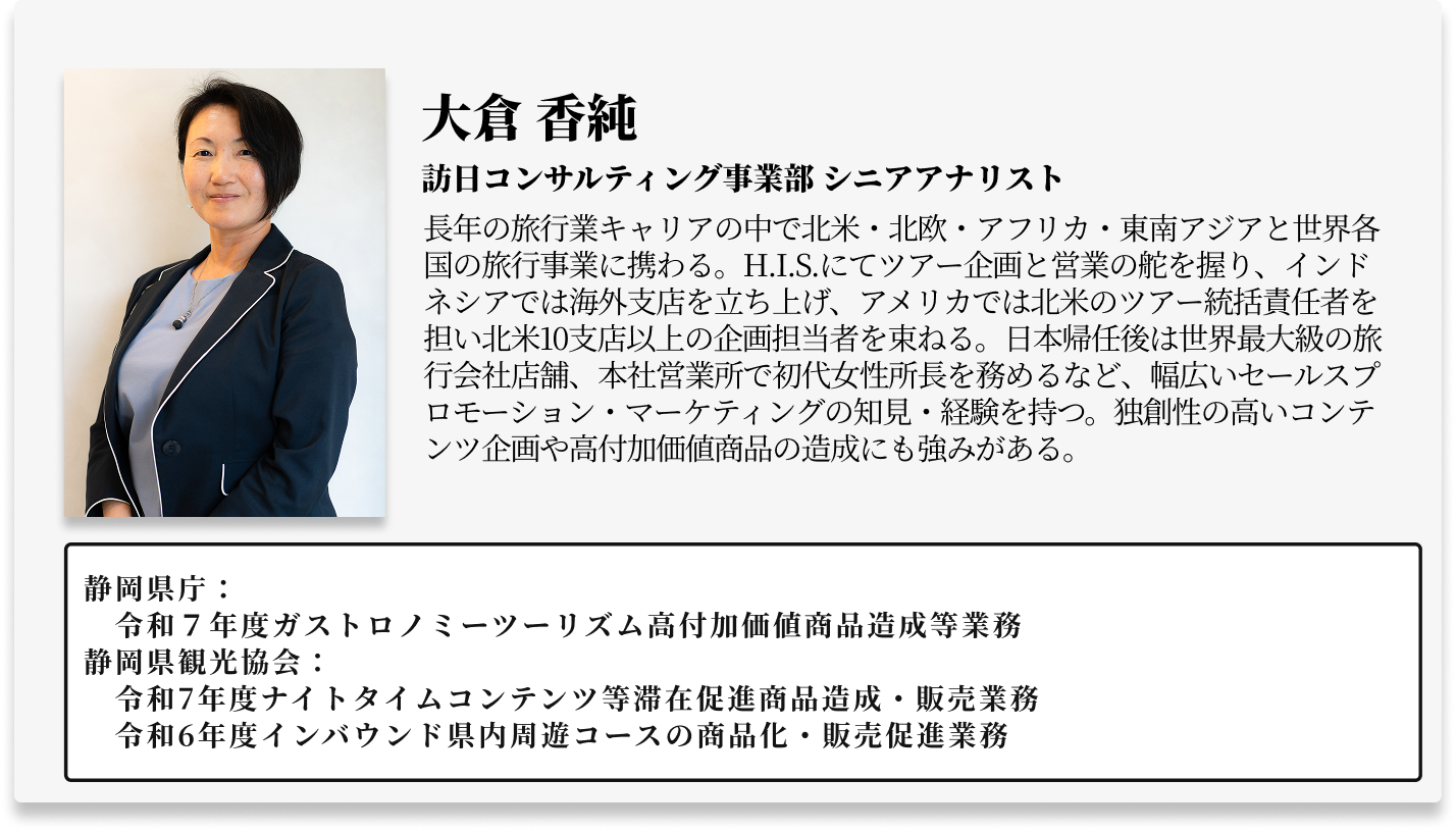 現地を巡って感じた浜松・浜名湖エリアの魅力や欧米豪の高付加価値訪日客目線による観光の印象、そして現状の課題感などをお話しいただきます。